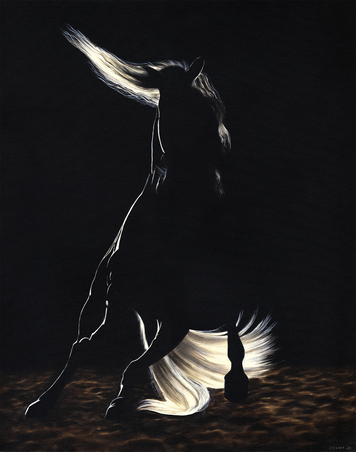 This painting presents the horse in a quiet, introspective pose. The deep black background immediately pulls the viewer in, and as a result, the warm highlights along the face and shoulder become the central focus. As the light moves gently across the contours, it reveals refined detail—the softness around the eye, the smooth lines of the muzzle, and the subtle strength in the neck.