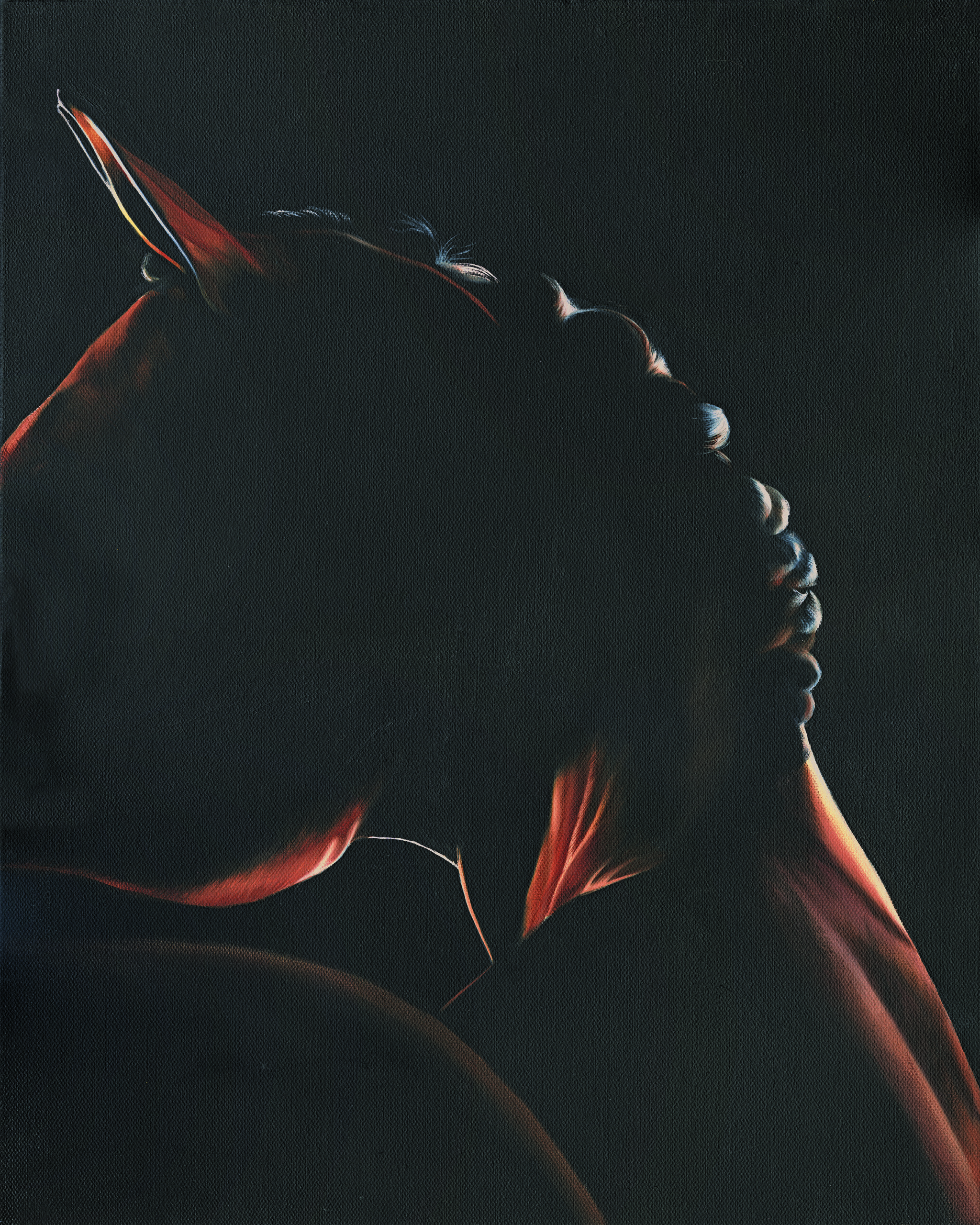 This painting captures the horse in an intimate, sculptural moment. The dark background creates a dramatic setting, and as a result, the illuminated areas feel even more intense. Deep, bright reds and glowing oranges move across the form, tracing the muscles and subtle curves with fiery precision. These warm tones contrast beautifully with the surrounding darkness, giving the piece a sense of heat and motion.